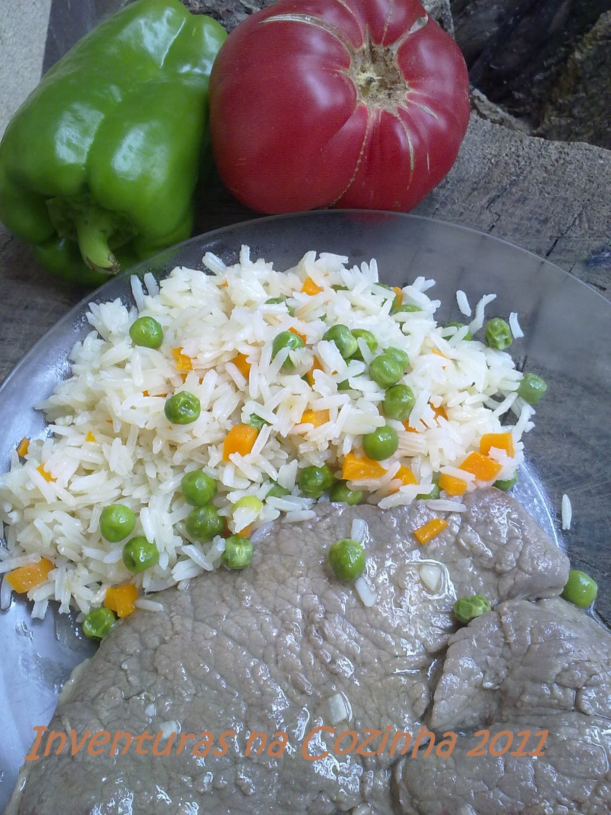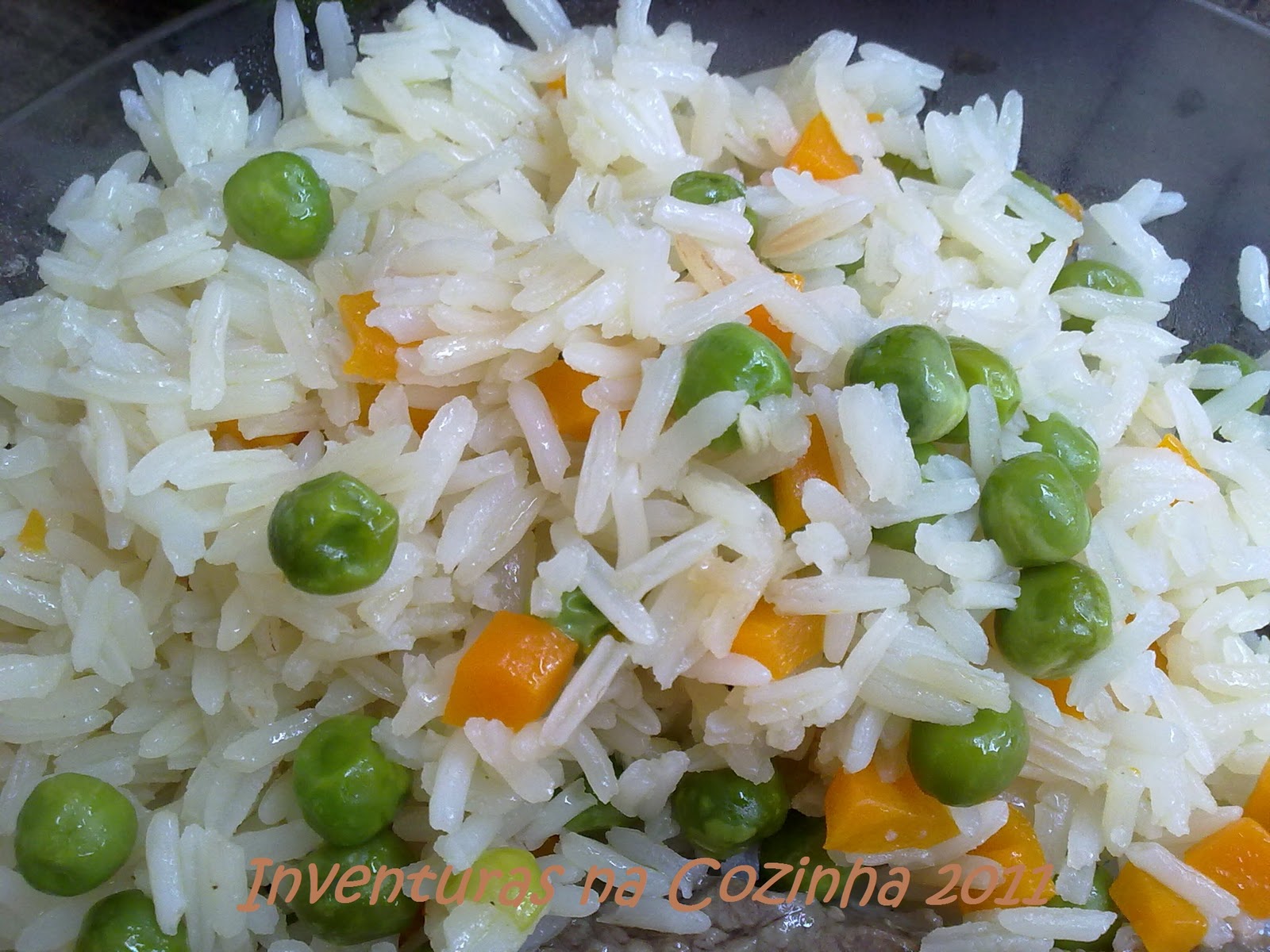 A minha sugestão é mais um arroz que faz as minhas delícias...fica soltinho e podemos variar bastante nas suas parcerias...desta vez foi com ervilhas e cenoura, um trio fantástico.